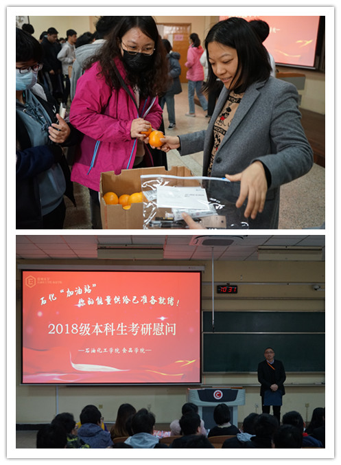 管春英結(jié)合自身求學經(jīng)歷激勵考生們在最后沖刺階段靜心聚力,以必勝的信念迎接挑戰(zhàn);鐘璟悉心詢問了各位考研學子的復習進度和心理狀態(tài),并給予針對性的意見;宣慧勉勵大家“一‘研’為定,明年一定研一”,踏上更高的平臺,迎接新的挑戰(zhàn);劉文杰對考研學子的執(zhí)著追夢精神表示肯定,并指出考研是提高學業(yè)水平的重要途徑,對未來發(fā)展起重要作用。最后,學院還為考研學子們發(fā)放石化“加油卡”、石化“加油包”、石化“加油橙”,祝愿所有考研學子心想事成,馬到成功!