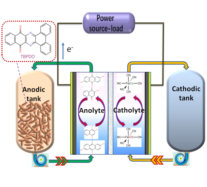 水系有機液流電池(AOFB)可使用具有高理論比容量、資源豐富、易規(guī)?;迫『铜h(huán)境友好的氧化還原活性有機分子/聚合物作為儲能電解質(zhì)材料,因而在大規(guī)模儲能方面應用前景廣闊。然而,有機材料在水溶液體系中的較低溶解度和高粘度特性極大地限制了它們的實際應用。我院曹劍瑜-許娟團隊最近設計開發(fā)了一種具有高比容量和快速的氧化還原反應動力學速率的有機固態(tài)儲能材料——三苯并[a,c,i]吩嗪-10,15-二酮(TBPDO), 通過利用TBPDO與兩種水溶性氧化還原穿梭分子(蒽黃酸和指甲花醌)之間能斯特電位驅(qū)動的單分子氧化還原靶向(SMRT)反應,有效規(guī)避了有機活性電解質(zhì)材料的溶解度限制,從而顯著提高AOFB的能量密度。組建的以TBPDO為陽極容量助推器的氧化還原靶向液流電池(RTFB)表現(xiàn)出顯著增強的容積比容量(能量密度)和高的材料利用率(80.2%)。在長期充放電循環(huán)期間,每個循環(huán)的容量保持率達到99.82%,平均能量效率80.7%。