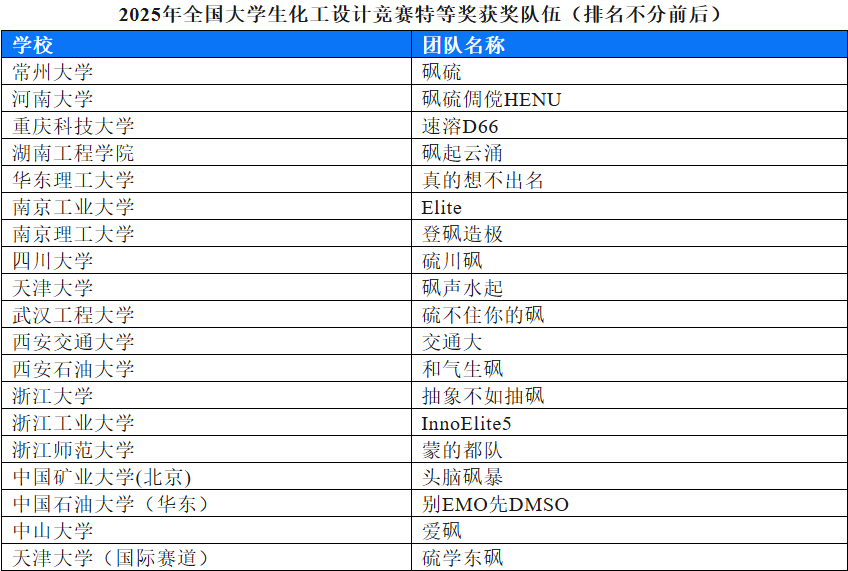 8月11日至8月17日,2025年“天正設(shè)計(jì)杯”第十九屆全國(guó)大學(xué)生化工設(shè)計(jì)競(jìng)賽總決賽在天津大學(xué)舉行。常州大學(xué)石油化工學(xué)院砜硫隊(duì)作品《福建凱美特年產(chǎn)1.5萬(wàn)噸二甲基亞砜項(xiàng)目》(參賽隊(duì)員:常佩源、張皓博、許正梁、薛晴、謝露;指導(dǎo)老師:石劍、馬江權(quán)、謝德華、周滿、黎珊)經(jīng)過(guò)江蘇省省賽、華東賽區(qū)選拔賽以及全國(guó)總決賽的激烈角逐,斬獲第十九屆全國(guó)大學(xué)生化工設(shè)計(jì)競(jìng)賽特等獎(jiǎng)。