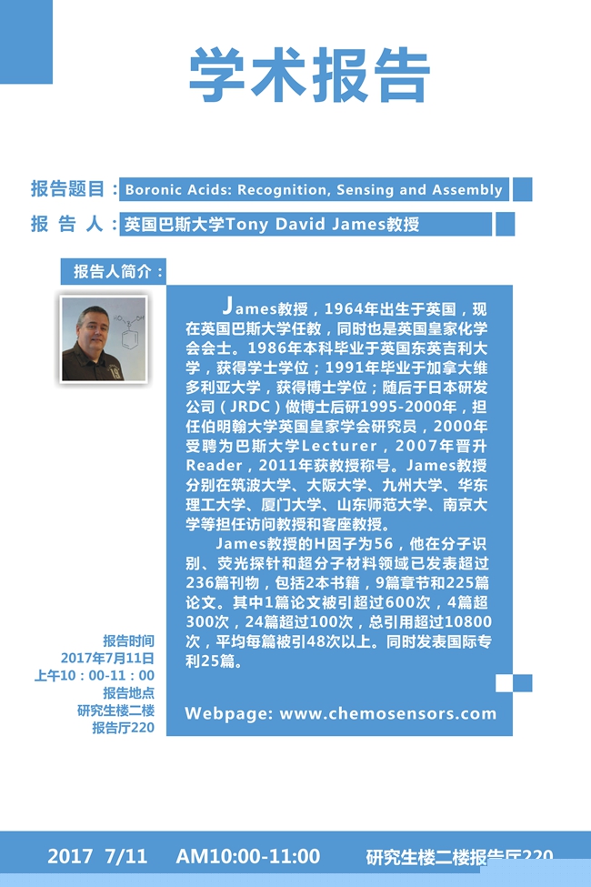 | 【學(xué)術(shù)】7月11日學(xué)術(shù)報告 —Boronic Acids:Recognition,Sensing and Assembly |