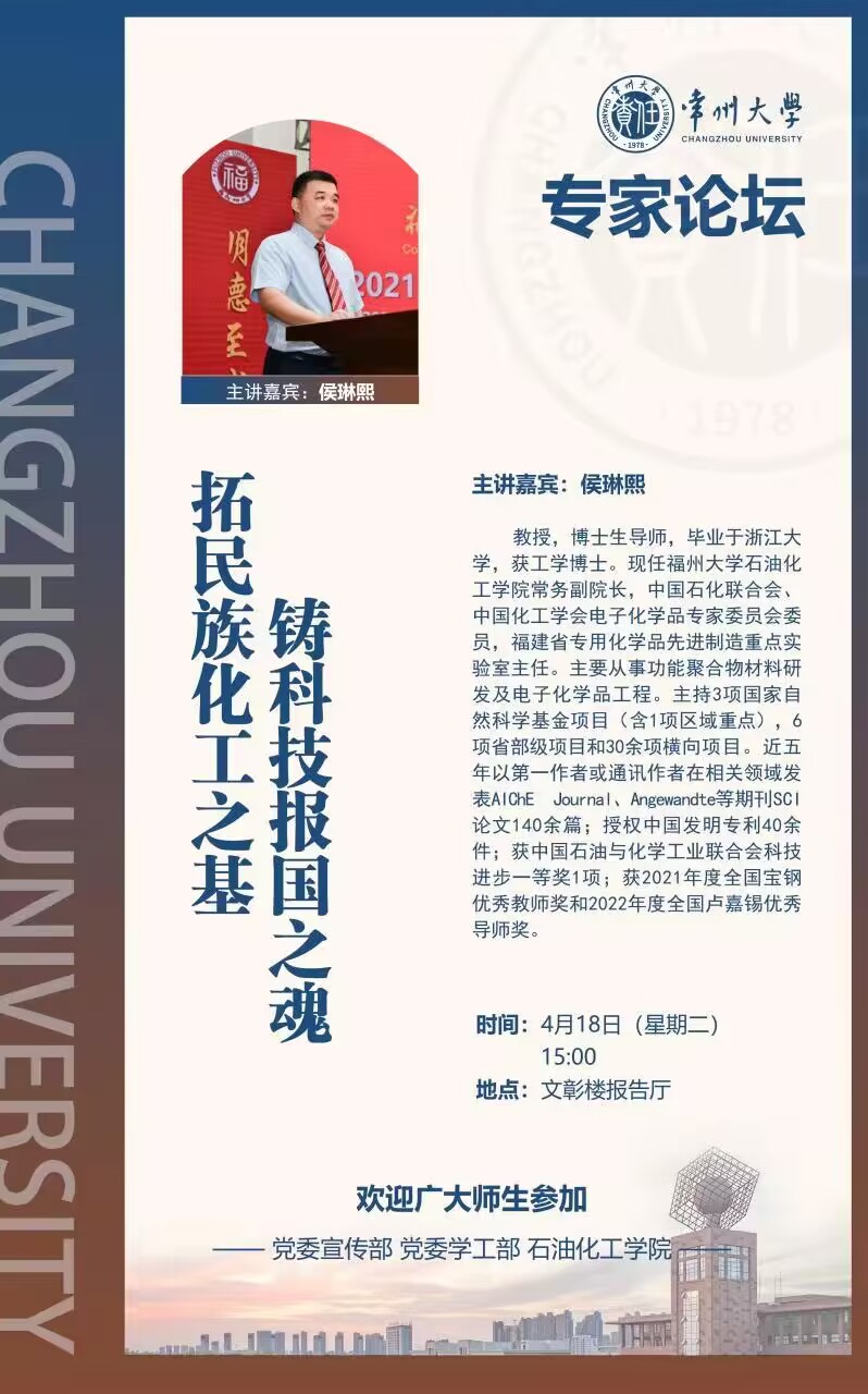 | 【學(xué)術(shù)講座】4月18日常州大學(xué)專家論壇:拓民族化工之基 鑄科技報(bào)國(guó)之魂 |