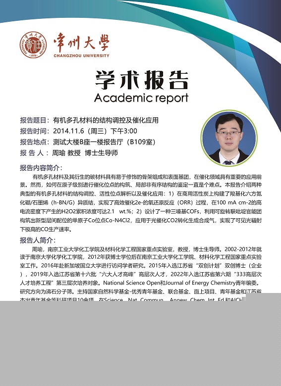 | 【學(xué)術(shù)報告】11月6日學(xué)術(shù)報告—王軍教授、周瑜教授 南京工業(yè)大學(xué) |