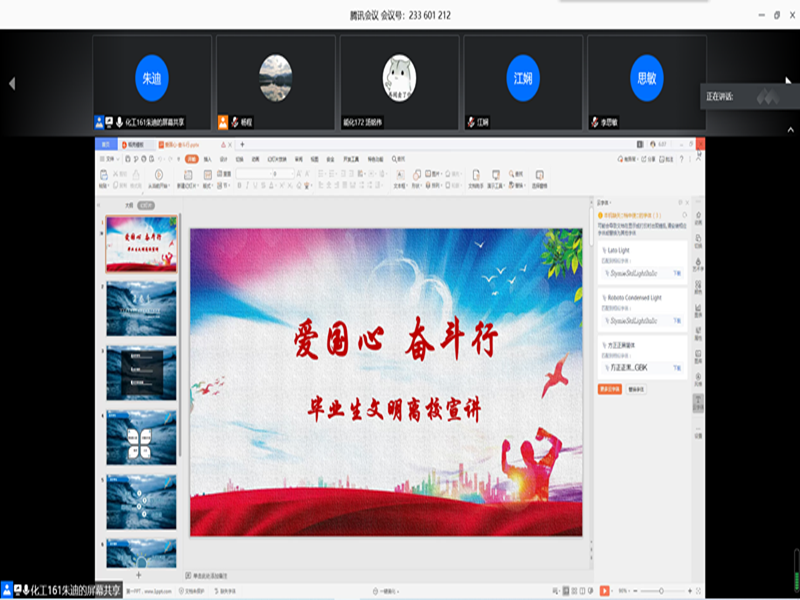 學院精心為每位畢業(yè)生制作畢業(yè)紀念優(yōu)盤,表達學院對畢業(yè)生的殷殷期盼,望石化學子奔涌前行;畢業(yè)學子創(chuàng)作畢業(yè)歌曲《化說再見》,記錄別樣青春時光;畢業(yè)典禮嚴肅活潑,讓畢業(yè)生擁有難忘且珍貴的記憶;考研宿舍感恩活動傳遞正能量,難忘宿管阿姨、食堂阿姨的關懷照顧;畢業(yè)班會憶往昔話今朝,師生情深,不說再見;考研學霸班級勵志成長,激勵石化學子乘風破浪;“青年講師團”畢業(yè)文明離校宣講活動,傳遞愛國情,砥礪奮斗行;誠信教育線上活動,學生感恩資助,自立自強;畢業(yè)班黨員學習經(jīng)驗分享,不忘初心,揚帆遠航;考研經(jīng)驗交流,站在學長學姐的肩膀,逐夢前行。