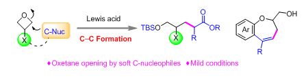 相關工作以題為“Mild C–C Bond Formation via Lewis Acid Catalyzed Oxetane Ring Opening with Soft Carbon Nucleophiles”(通過路易斯酸催化的氧雜環(huán)丁烷軟碳親核試劑開環(huán)反應實現C-C成鍵)在線發(fā)表在《德國應用化學》(Angew. Chem. Int. Ed.)上。常州大學為該論文的第一通訊單位,黃海博士為第一作者,在讀碩士張?zhí)煊顬榈诙髡?,孫建偉為論文的通訊作者。