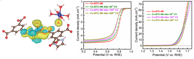 純相金屬有機(jī)骨架(MOFs)在催化領(lǐng)域具有巨大的應(yīng)用潛力,但是由于這類材料的導(dǎo)電性不夠高,在能源轉(zhuǎn)換和存儲(chǔ)電催化領(lǐng)域中應(yīng)用受到的限制。銀鳳翔、陳標(biāo)華課題組理論計(jì)算研究發(fā)現(xiàn),MOFs中的不飽和配位能降低空間位阻,促進(jìn)活性中心與水分子和氧氣分子的相互作用,降低電子傳導(dǎo)阻力,提高材料的導(dǎo)電性,使得這種MOFs在電催化中具有增強(qiáng)的質(zhì)量傳遞和電子傳遞特性。根據(jù)這一發(fā)現(xiàn),課題組采用鈷離子、均苯三甲酸和咪唑通過(guò)水熱反應(yīng)合成了金屬有機(jī)骨架Co-BTC-IMI,該材料中的一個(gè)Co離子分別被兩個(gè)去質(zhì)子化的均苯三甲酸連接,構(gòu)建了Co金屬中心的不飽和配位。該金屬有機(jī)骨架在堿性半電池中可提供0.80 V(參比可逆氫電極)的氧氣還原反應(yīng)半波電勢(shì),并在10 mA·cm-2電流密度下提供了1.59 V(參比可逆氫電極)的氧氣析出反應(yīng)電勢(shì)。該工作在將純相MOFs直接應(yīng)用于氧氣電催化領(lǐng)域中取得了突破性進(jìn)展,為能源轉(zhuǎn)換和存儲(chǔ)科學(xué)和技術(shù)的發(fā)展提供了新的思路。近日,該成果已經(jīng)發(fā)表于國(guó)際頂級(jí)期刊Journal of Materials Chemistry A上。此項(xiàng)工作得到了江蘇省綠色催化重點(diǎn)實(shí)驗(yàn)室、江蘇省自然科學(xué)基金以及國(guó)家自然科學(xué)基金的資助。