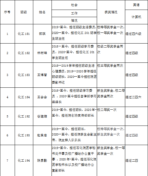 根據(jù)我校發(fā)展學(xué)生黨員公示制的有關(guān)規(guī)定,經(jīng)石油化工學(xué)院食品學(xué)院第一學(xué)生黨支部討論決定和石油化工學(xué)院食品學(xué)院黨委審議,擬發(fā)展下列同志為中共預(yù)備黨員。現(xiàn)將基本情況公示如下:
