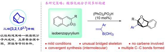 近日,黃海教授與孫建偉教授課題組在Angew. Chem. Int. Ed.上發(fā)表題為“A Mild Intermolecular Synthesis ofCyclopropane-Incorporated Tricyclic Skeleton: Unusual Reactivity of Isobenzopyryliums”的研究論文。復(fù)雜的結(jié)構(gòu)骨架,特別是帶有張力小環(huán)的骨架結(jié)構(gòu)是天然產(chǎn)物較為多見的母體結(jié)構(gòu),但是由于結(jié)構(gòu)的復(fù)雜性和不穩(wěn)定性,這一類骨架的構(gòu)建一直以來是具有挑戰(zhàn)性的工作。例如,三環(huán)[3,2,1,02,7]辛烷就是這樣一類復(fù)雜又帶有張力小環(huán)的骨架結(jié)構(gòu),以往的構(gòu)建策略都需要涉及金屬卡賓、高溫等苛刻反應(yīng)條件來克服動(dòng)力學(xué)或熱力學(xué)不利的問題。本論文實(shí)現(xiàn)了一種在普通酸催化下的苯并異吡喃鹽與烯基硼酸連續(xù)[4+2]環(huán)加成/關(guān)環(huán)反應(yīng),成功構(gòu)建了氧雜三環(huán)[3,2,1,02,7]辛烷骨架結(jié)構(gòu)。該類結(jié)構(gòu)預(yù)計(jì)在藥物分子中具有潛在的應(yīng)用價(jià)值。同時(shí),后期合成應(yīng)用顯示,目標(biāo)分子具有很高的合成價(jià)值,是一類不可或缺的骨架結(jié)構(gòu)。