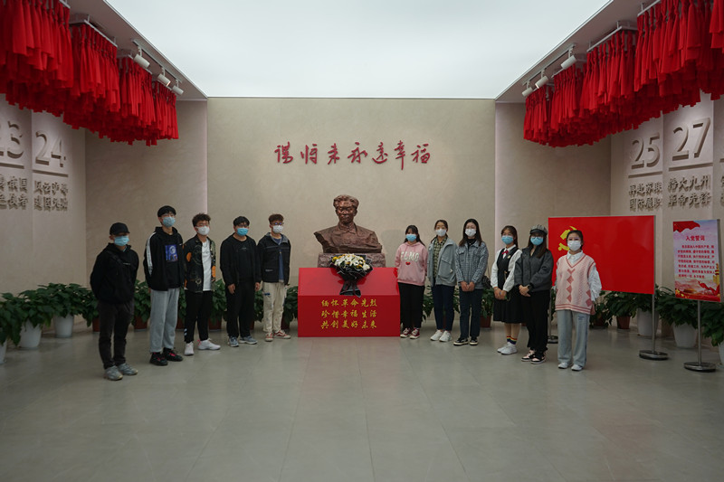 在張?zhí)准o(jì)念館前同學(xué)們?nèi)w站立、齊唱國(guó)歌,團(tuán)委副書記許涵僑以新時(shí)代繼承和弘揚(yáng)革命精神、追憶革命故事和緬懷英雄先烈為主題進(jìn)行演講,全體成員集體觀看張?zhí)咨绞论E展覽。