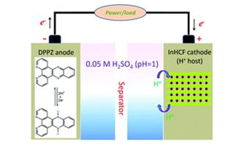 我院曹劍瑜-許娟團隊最近在Chemical Communications上發(fā)表研究論文(DOI: 10.1039/d1cc01486b)。水系可充電電池通常以金屬離子為電荷載體。然而,金屬元素要么儲量有限,要么開采成本相對較高。在所有離子中質(zhì)子(氫離子)是最輕和最小的,在水溶液中具有最快的遷移速率,而且在地球上資源豐富。本論文設(shè)計了一種基于有機陽極和無機配合物陰極的水系可充電質(zhì)子電池。陽極二吡啶吩嗪中氧化還原活性吡嗪單元的可逆胺化和陰極銦普魯士藍中質(zhì)子的快速嵌入-脫嵌使該電池在1 Ag -1下可實現(xiàn)37 mAhg -1的可逆比容量,并展示了良好循環(huán)穩(wěn)定性和出色的倍率性能。此項研究得到了國家自然科學(xué)基金和江蘇省綠色催化重點實驗室科學(xué)基金的資助。