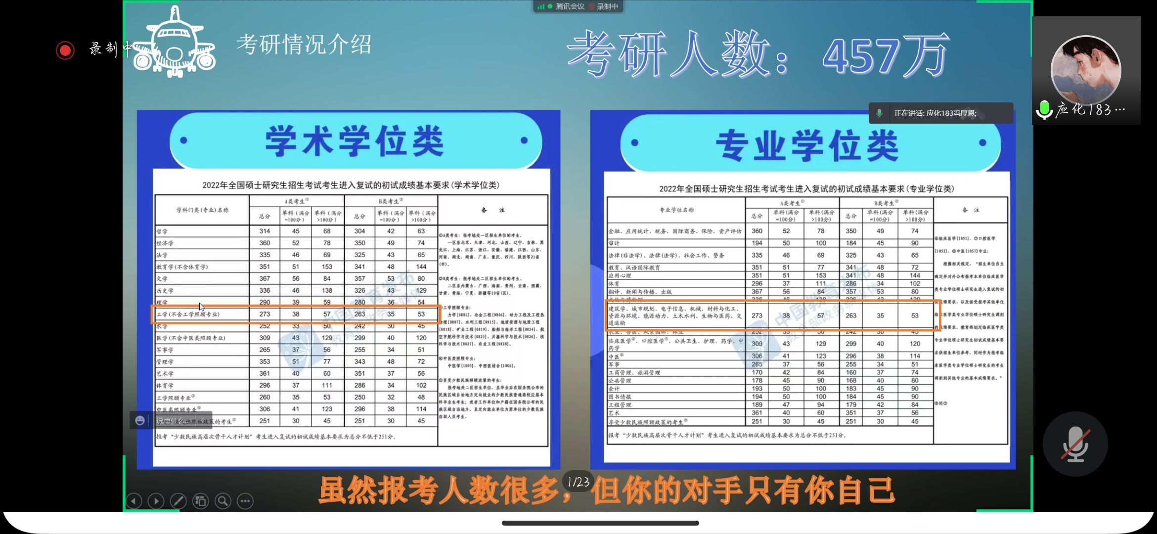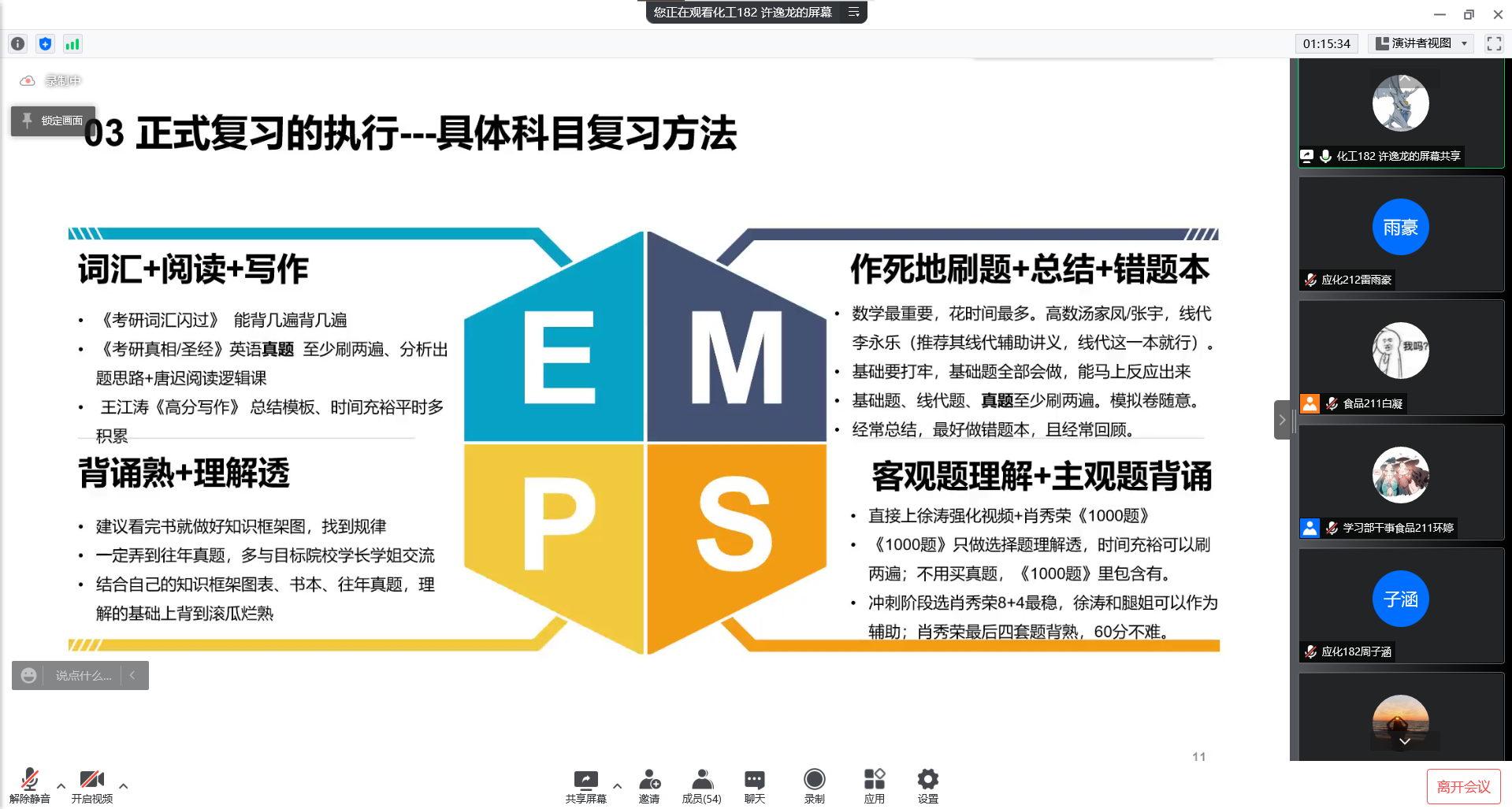 為營造良好學風,鼓勵學生挖掘自身潛能、把握深造機會,我院于2022年4月15日、22日、29日在騰訊會議開展三場“研”路有你主題榜樣宣講活動,本次宣講由成功上岸南京大學、廈門大學、大連理工大學、中國石油大學和華東理工大學等14所高校的學生主講。