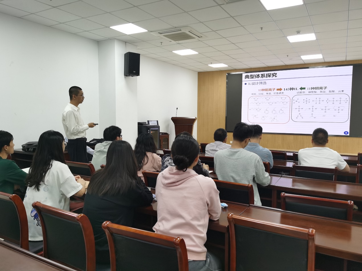戚律老師作了“過程強(qiáng)化視角下典型化工分離體系探究”的報(bào)告,他于2021年4月-2022年3月在上海交通大學(xué)羅正鴻教授聚合反應(yīng)工程實(shí)驗(yàn)室訪學(xué),報(bào)告會上,戚老師介紹了他近幾年在化工分離領(lǐng)域基于離子液體所做的多尺度過程強(qiáng)化研究,和大家探討了化工學(xué)科做研究的心得體會。