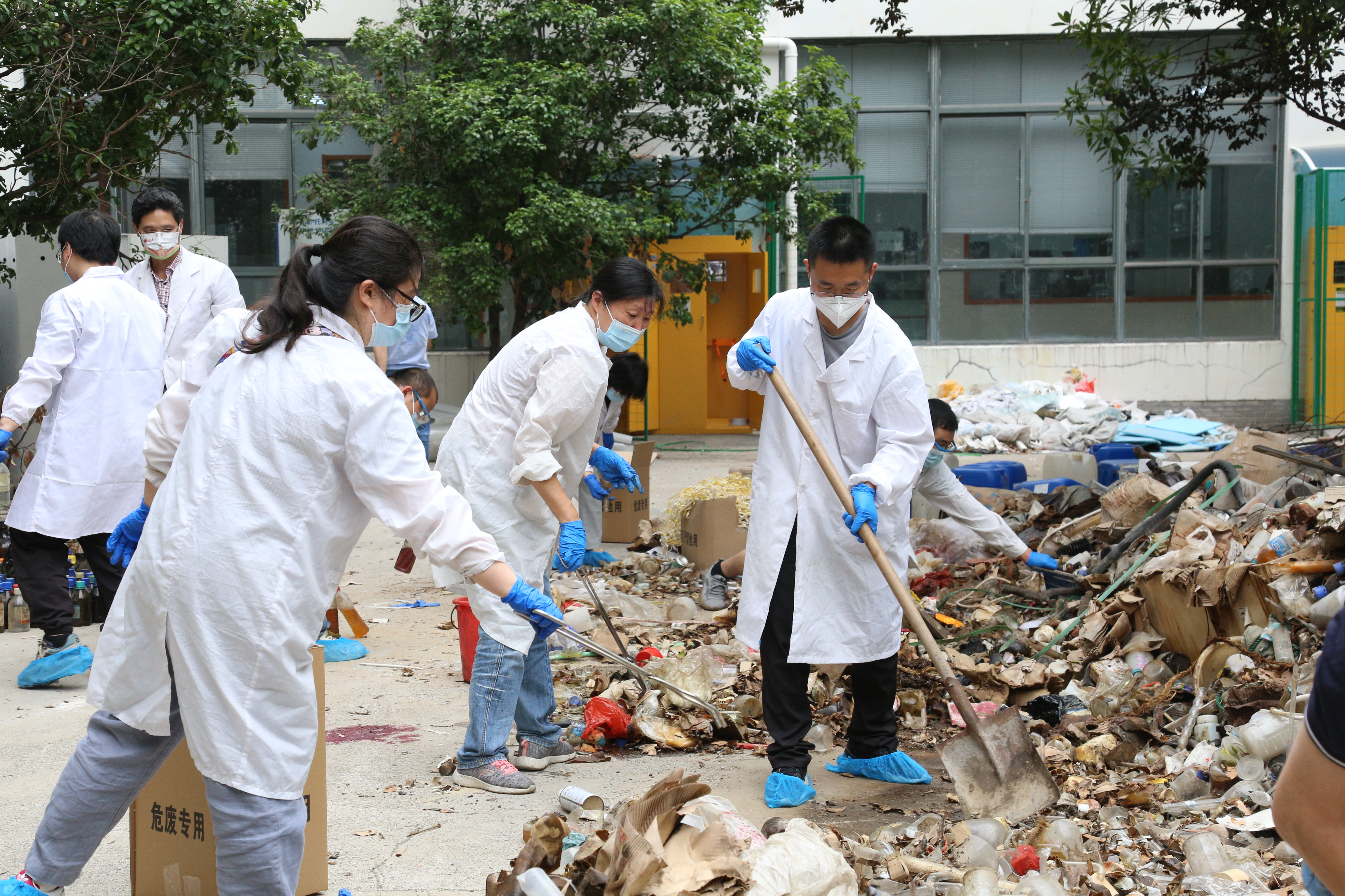 知行樓改造工程過(guò)程中清理出的化工廢棄物被堆積在小院西南及西北角造成安全隱患,由分工會(huì)發(fā)起,在全體有化工相關(guān)知識(shí)的老師中招募志愿者,組織突擊隊(duì)對(duì)這些化工廢棄物進(jìn)行專業(yè)處理,很多黨員主動(dòng)請(qǐng)纓,加入到了化工垃圾清零行動(dòng)中。
