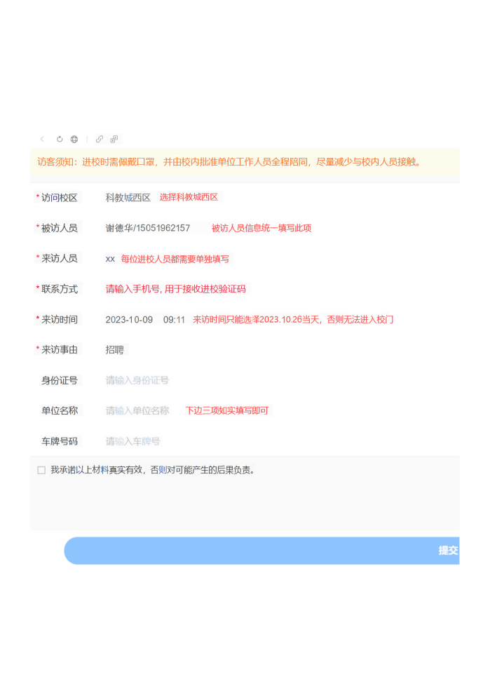③信息填寫(xiě)完畢后點(diǎn)擊提交,審核通過(guò)后將收到預(yù)約信息登記成功短信并附帶入校鏈接,入校時(shí)請(qǐng)點(diǎn)擊鏈接生成入校二維碼并向門(mén)衛(wèi)出示即可。