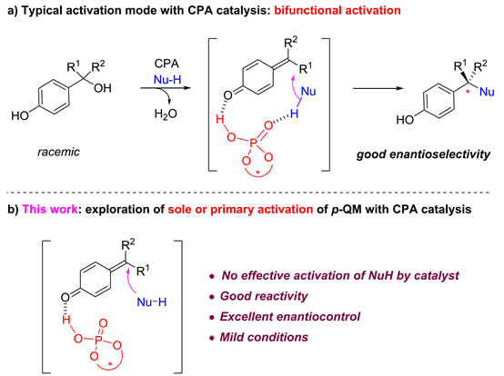 對亞甲基醌(p-QM)的手性轉(zhuǎn)化在不對稱合成領(lǐng)域已經(jīng)成為一種非常具有吸引力的手段,近年來引起了廣泛關(guān)注。這得益于其遠(yuǎn)程1,6-加成后快速構(gòu)建四級碳手性中心的特性。在過去手性磷酸參與的p-QM轉(zhuǎn)化中,值得注意的是,手性磷酸往往都需要發(fā)揮其雙功能催化劑的作用,不僅要活化p-QM的羰基位置,同時也需要與親核試劑(如吡咯、吲哚、萘酚)之間通過氫鍵作用來進(jìn)一步幫助手性識別。在這一活化模型當(dāng)中,親核試劑與手性磷酸之間的氫鍵作用不僅可以幫助穩(wěn)定對映選擇性的過渡態(tài),也可以增強(qiáng)親核試劑的親核性,因此,具有良好氫鍵給體的親核試劑極為重要。這在諸多文章中的控制實驗都有明顯體現(xiàn),當(dāng)親核試劑上的作用位點被屏蔽后,反應(yīng)結(jié)果往往大幅下降(ee值或產(chǎn)率)。迄今為止,在手性磷酸催化的p-QM化學(xué)中采用無明顯作用位點的親核試劑實現(xiàn)高效的對映選擇性轉(zhuǎn)化還沒有相關(guān)報道。孫建偉和黃海課題組首次采用N甲基保護(hù)的吲哚作為親核試劑,實現(xiàn)了一系列新型的吲哚基手性四芳基甲烷球形分子(Chem. Sci.2023, DOI: 10.1039/D3SC05014A)。在反應(yīng)優(yōu)化過程中,通過調(diào)節(jié)手性磷酸的結(jié)構(gòu),采用具有大位阻邊臂的手性磷酸BINOL-2,6-2iPr-4-Ad-Ph成功實現(xiàn)了無明顯氫鍵作用位點的親核試劑在p-QM化學(xué)中的高對映選擇性轉(zhuǎn)化。本文第一作者是常州大學(xué)青年教師韓政宇副教授。本項工作也是孫建偉和黃海課題組在手性多芳基甲烷研究領(lǐng)域又一重要的延續(xù)工作(1. Org. Lett. 2023, 25, 8478–8483; 2. Chem. Synth. 2023, 3, 32; 3. Org. Lett. 2023, 25, 477-482; 4. Org. Lett., 2022, 24, 4246-4251; 5. Chem. Commun., 2022, 58, 7128-7131.)。