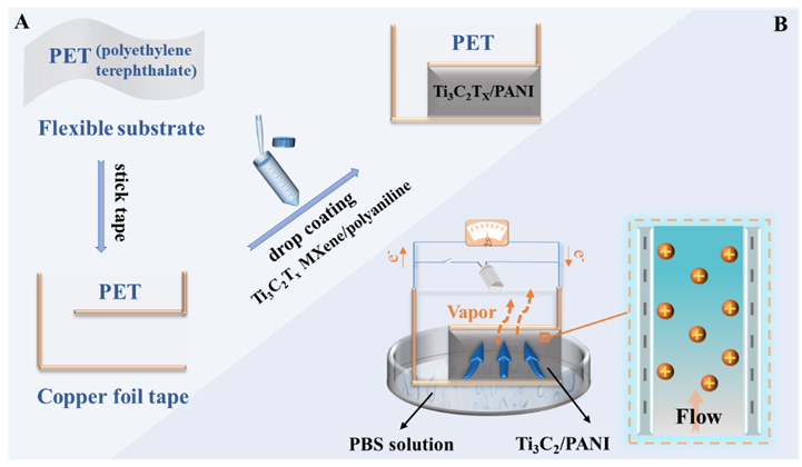 Figure 1. (A) Schematic illustration of the preparation process of theflexible Ti3C2?PANI hydrovoltaic generator. (B) Schematic diagramof the working principle of the evaporation-driven HVC.