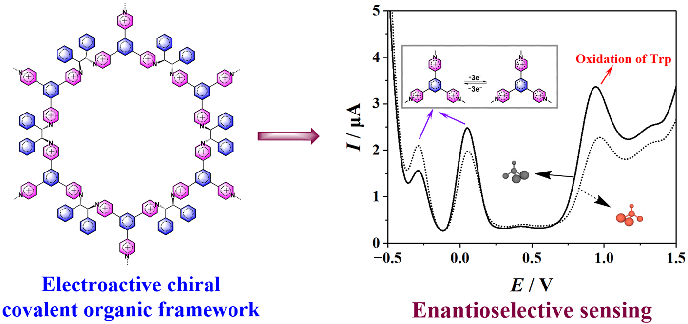 利用吡啶鎓離子有一定電化學響應的特點,該研究小組嘗試制備了具有電化學活性的手性共價有機框架材料實現(xiàn)對氨基酸和氨基醇分子的手性識別(Anal. Chem.2024, 96, 3200?3207)。此外,該研究小組也報道了一系列二茂鐵基參與的基于靜電吸引和π-π+作用的手性傳感器(Anal. Chem.2020, 92, 13711?13717;Anal. Chem.2021, 93, 10160?10166;Anal. Chem.2022, 94, 6050?6056)。