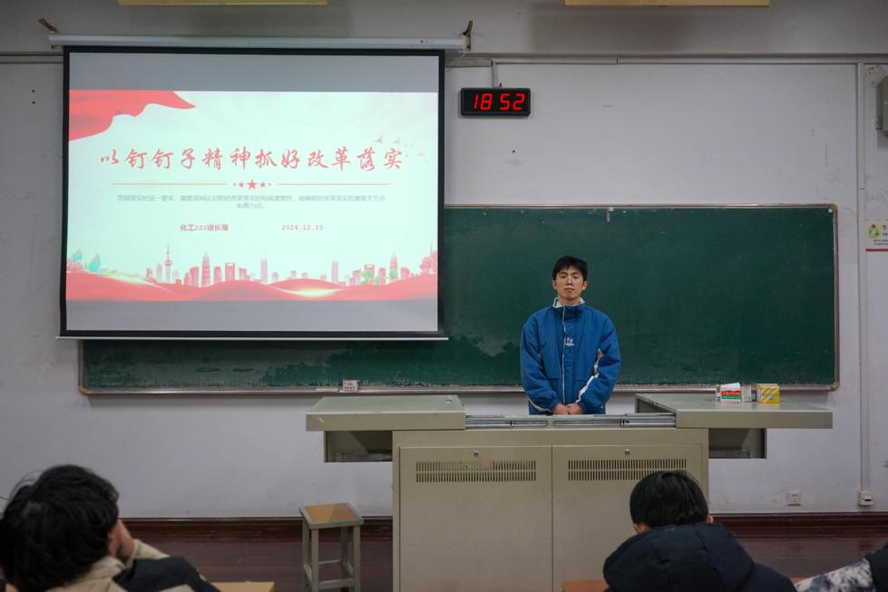 為積極響應(yīng)黨的二十屆三中全會的號召,以釘釘子精神全面推動各項(xiàng)改革舉措的落實(shí),我院于12月10日在W1205教室開展了“青年講師團(tuán)”系列講座第五講——以釘釘子精神抓好改革落實(shí)。本次講座由學(xué)生第一黨支部化工222徐長海主講,我院學(xué)生代表參加。
