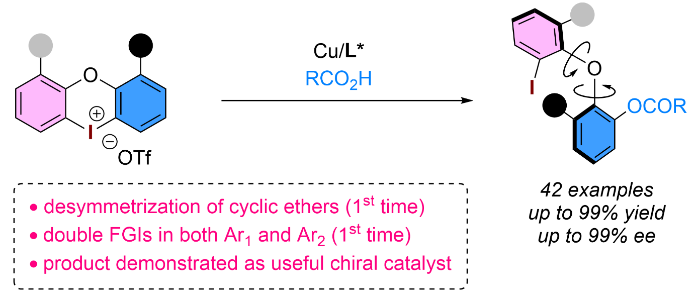 高效構(gòu)建軸向手性二芳基醚(ACDEs)是有機(jī)合成中一項(xiàng)重要且新興但極具挑戰(zhàn)性的任務(wù)。現(xiàn)有基于去對(duì)稱化策略的成功案例僅限于非環(huán)芳基醚,且僅能對(duì)四個(gè)取代基中的一個(gè)進(jìn)行單一修飾,模塊化程度較低。黃海和孫建偉課題組近日首次開(kāi)發(fā)了一種雙取代基同步修飾的對(duì)映選擇性合成策略,實(shí)現(xiàn)了ACDEs結(jié)構(gòu)的靈活多樣化構(gòu)建。基于環(huán)狀二芳基碘鎓鹽的開(kāi)環(huán)反應(yīng),建立了一種溫和的銅催化方法,在溫和條件下實(shí)現(xiàn)了優(yōu)異的反應(yīng)效率、對(duì)映選擇性和良好的區(qū)域選擇性。所獲得的高對(duì)映體純度ACDEs產(chǎn)物可作為高效手性催化劑應(yīng)用于不對(duì)稱合成領(lǐng)域。