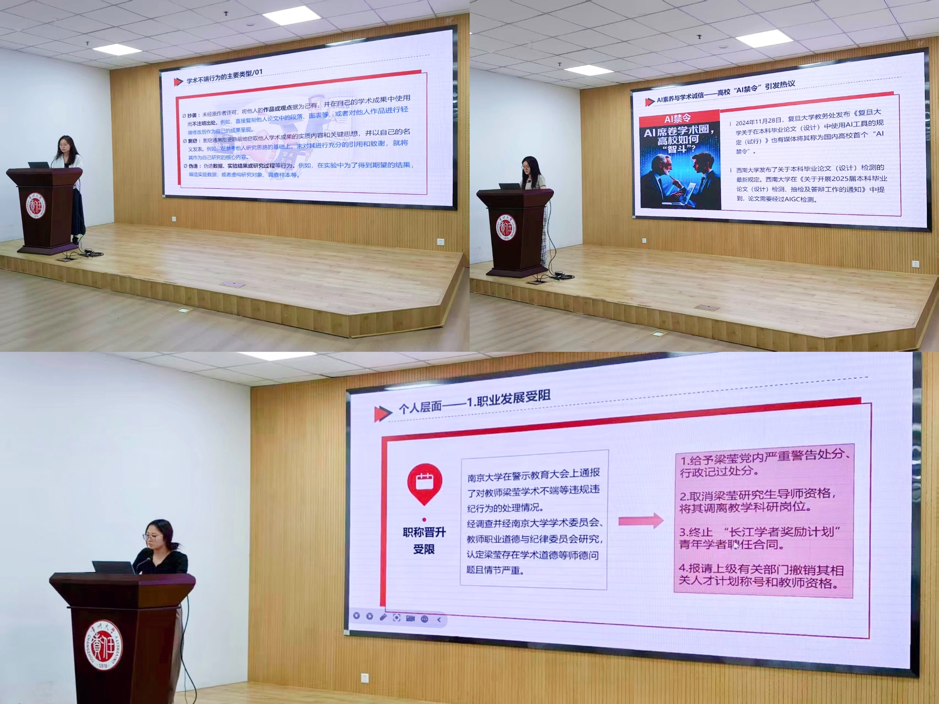 活動(dòng)中,李欣庭根據(jù)《高等學(xué)校預(yù)防與處理學(xué)術(shù)不端行為辦法》,介紹了抄襲、數(shù)據(jù)造假、文獻(xiàn)篡改等七種類型的學(xué)術(shù)不端行為及其界定標(biāo)準(zhǔn);韓明楊結(jié)合近年來通報(bào)的學(xué)術(shù)不端典型案例,揭示學(xué)術(shù)不端對個(gè)人、學(xué)術(shù)共同體及社會(huì)信任的嚴(yán)重危害;唐一航聚焦AI技術(shù)浪潮,深入探討其應(yīng)用帶來的學(xué)術(shù)誠信新挑戰(zhàn),并分享數(shù)字化時(shí)代堅(jiān)守學(xué)術(shù)底線的實(shí)踐路徑。