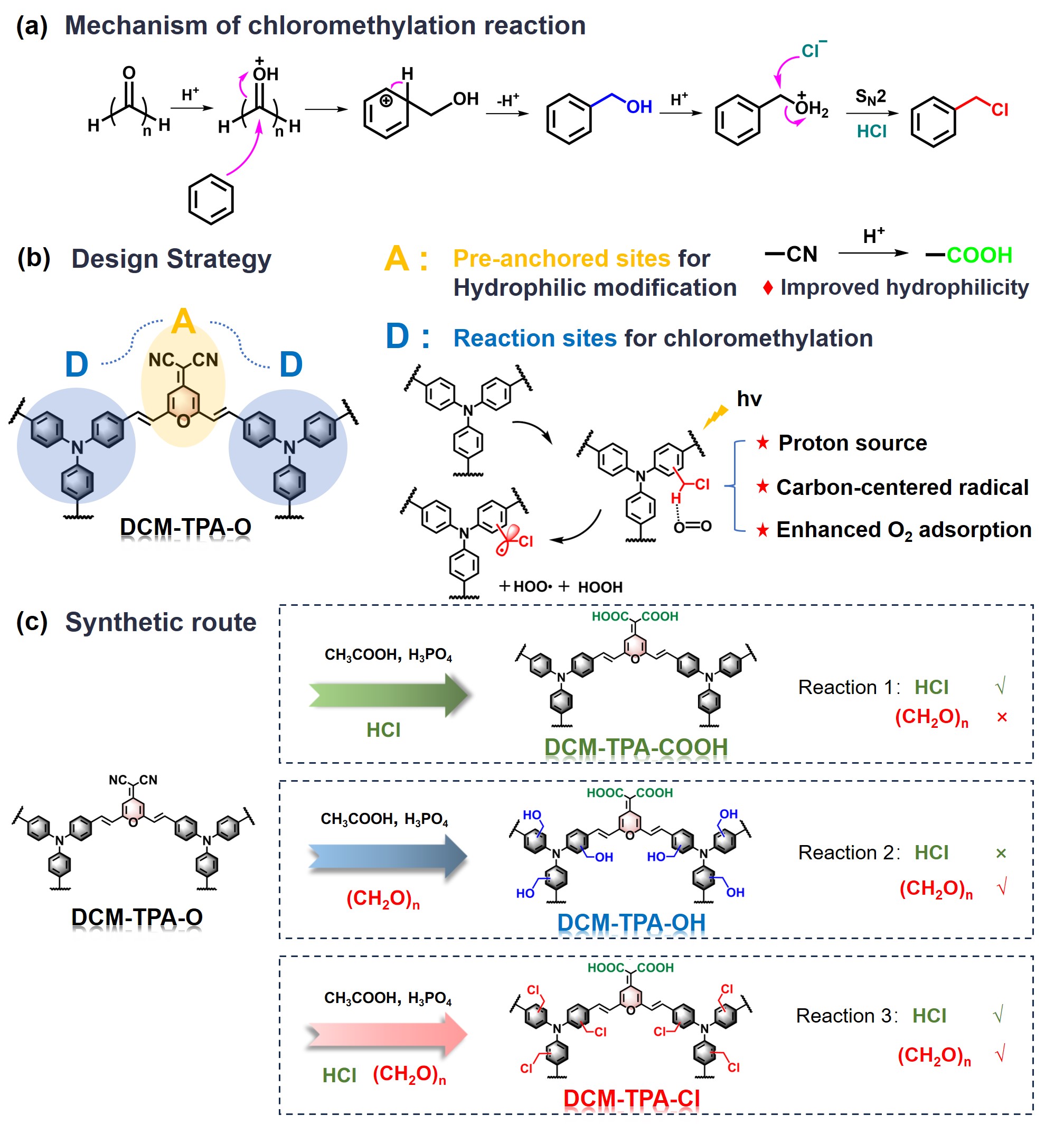 (1)針對氧氣吸附能力不足的問題,在CMPs材料中通過后修飾反應(yīng)引入吸電子基團是解決此問題的好方法(圖1)。在之前的工作中引入磺酸基和季銨鹽(Adv. Funct. Mater.2025, 35, 2415244)的基礎(chǔ)上,我們首次將氯甲基引入CMPs中用于高效生產(chǎn)H2O2。在聚合物催化劑的制備中,氯甲基修飾的聚合物常用作傅-克烷基化等交聯(lián)反應(yīng)的中間體,因其疏水性而未在光催化產(chǎn)H2O2領(lǐng)域引起重視。經(jīng)典的Blanc氯甲基化反應(yīng)常用聚甲醛和鹽酸為氯甲基化試劑,磷酸或冰醋酸等為縮合劑。基于此,我們在材料設(shè)計中以三苯胺為反應(yīng)位點,以氰根為酸化位點,通過一步氯甲基化反應(yīng),同時引入氯甲基和羧基,分別用于增強氧氣吸附和改善親水性。經(jīng)氯甲基修飾的CMPs在純水和空氣中的產(chǎn)H2O2速率達到5.0 mmol g-1 h-1,在氧氣氛圍中的性能僅增長1.8%,證明其氧氣吸附能力之強。而在苯甲醇和水的混合溶劑中性能更是達到了38.0 mmol g-1 h-1,超過大多數(shù)目前已報到的催化劑。該工作以Chloromethylation modified pyranonitrile-based conjugated microporous polymers for selective one-step two-electron O2 reduction to H2O2為題,發(fā)表在化學(xué)領(lǐng)域頂級期刊Angew. Chem. Int. Ed.2025, 64, e202508436。