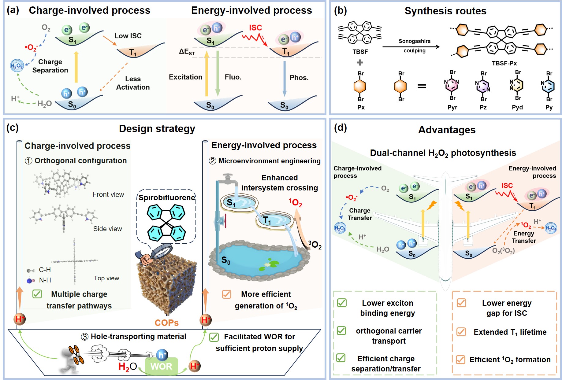 (3)針對能量路徑較弱的問題,我們探索了將傳統(tǒng)的電荷路徑與能量路徑耦合的策略。能量路徑是指以單線態(tài)氧(1O2)為關(guān)鍵中間體生產(chǎn)H2O2,1O2主要由三線態(tài)氧(3O2)產(chǎn)生,此過程涉及從三重激發(fā)態(tài)(T1)回到基態(tài)(S0)的能量轉(zhuǎn)移。目前大多數(shù)催化劑的T1壽命較短,難以穩(wěn)定存在,這是能量路徑研究較少的主要原因。為此,我們繼續(xù)以螺二芴為結(jié)構(gòu)單元,通過交聯(lián)劑的微環(huán)境調(diào)控制備一系列COPs催化劑,提高其電荷和能量雙路徑的性能(圖3)。其優(yōu)點包括:在電荷路徑,降低了激子結(jié)合能,提高電荷分離效率,通過正交通道增強電荷傳輸;在能量路徑,降低了從單重激發(fā)態(tài)(S1)到T1的能壘,加速系間竄躍,延長T1壽命,從而提高生產(chǎn)1O2的效率。優(yōu)化后的COPs催化劑在在純水和空氣中的產(chǎn)H2O2速率達到7.21 mmol g-1 h-1,太陽能-化學(xué)能轉(zhuǎn)化效率更是高達1.88%。該類催化劑在三相漂浮體系、太陽光照實驗、連續(xù)流實驗和滅菌實驗中均取得了較好的性能。該工作以Achieve a simultaneous charge- and energy-involved dual-channel mechanism in spirobifluorene-based conjugated organic polymers for enhanced H2O2 photosynthesis為題發(fā)表在化學(xué)領(lǐng)域頂級期刊J. Am. Chem. Soc.2025, DOI: 10.1021/jacs.5c16544.