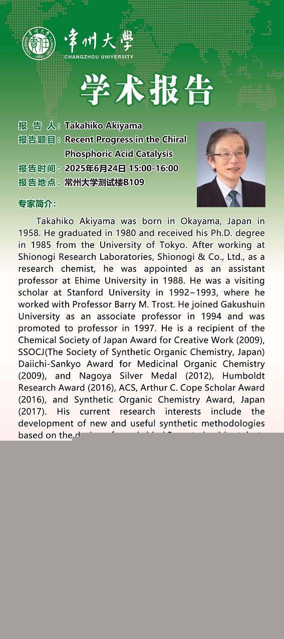 | 【學(xué)術(shù)報(bào)告】6月24日功能雜環(huán)研究院學(xué)術(shù)報(bào)告—Takahiko Akityama教授 學(xué)習(xí)院大學(xué) 朱晨教授 上海交通大學(xué) |
