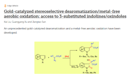 近日,石油化工學院孫江濤教授課題組在化學頂級期刊《Chemical Science》上發(fā)表題為“Gold-catalyzed stereoselective dearomatization/metal-free aerobic oxidation: access to 3-substituted indolines/oxindoles”的通訊文章,這是我校在此期刊上發(fā)表的第一篇通訊論文。Chemical Science是英國皇家化學會(the Royal Society of Chemistry)的旗艦期刊,報道化學學科原創(chuàng)性研究成果,是化學綜合領(lǐng)域最有影響力的三大期刊之一,也是國際上衡量科研小組研究水平的重要標志性期刊。