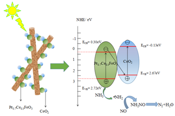 Rational construction of direct Z-scheme doped perovskite/palygorskitenanocatalyst for photo-SCR removal of NO: Insight into the effect of Ceincorporation Xiazhang Li *, Haiyang Shi , Xiangyu Yan , ShixiangZuo , Yuying Zhang , Qun Chen , Chao Yao *,Chaoying Ni*,Journal of Catalysis 369 (2019) 190–200 原文鏈接: https://www.sciencedirect.com/science/article/pii/S0021951718304391?dgcid=author 針對脫硝催化劑低溫活性差,抗硫抗水性弱,成本高的難題,本團隊近年來嘗試將光驅動引入傳統(tǒng)SCR催化脫硝體系,基于“固溶析出相”的理念,以天然凹凸棒石(坡縷石)為基體,相繼設計了Mn離子摻雜type-I型(ChemicalEngineeringJournal, 2017, 320, 211-221),Ni離子摻雜type-II型photo-SCR催化劑(Applied Catalysis B: Environmental,2018,231, 92–100),巧妙解決了光生載流子易復合的難題,并構建了石墨烯介質的間接Z-Scheme(Journal of Catalysis,2018,357,59–68),氮摻雜碳量子點修飾的直接Z-Scheme催化劑(ACS Sustainable Chem. Eng, 2018, 6,6, 10616?10627),解決了光生電荷遷移后氧化還原活性變差的難題。本工作在此基礎上,在鈣鈦礦中引入Ce離子,通過費米能級的調控引導在凹凸棒石表面形成摻雜PrFeO3/CeO2直接Z-Scheme“固溶析出相”異質結,無須傳導介質,有效提升了光能吸收,保持了高氧化還原活性的同時表現(xiàn)出良好的低溫抗硫抗水性。該工作得到了國家自然科學基金(51674043)和江蘇省國際科技合作項目(BZ2015040)的資助,同時得到了美國特拉華大學電鏡中心主任倪超英教授的大力支持。