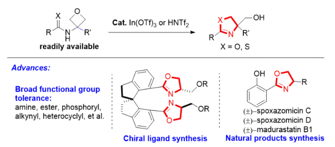 A Mild Catalytic Synthesis of 2-Oxazolines via Oxetane Ring-Opening: Rapid Access to A Diverse Family of Natural Products Hai Huang,Wen Yang,Zuliang Chen,Zengwei Laiand Jianwei Sun* 近日,孫建偉和黃海教師課題組在化學(xué)國際頂級刊物Chemical Science上發(fā)表題為“A Mild Catalytic Synthesis of 2-Oxazolines via Oxetane Ring-Opening: Rapid Access to A Diverse Family of Natural Products”的研究論文。論文通訊聯(lián)系人為孫建偉教授,第一作者為石油化工學(xué)院新進(jìn)青年教師黃海博士。噁唑啉類化合物在生物活性分子以及金屬配體中都有廣泛的應(yīng)用。關(guān)于該類化合物的合成目前只能依賴于非催化地胺基醇或者N-烯丙基甲酰胺類化合物的環(huán)合反應(yīng)。該工作巧妙地將甲酰胺鍵引入到氧雜環(huán)丁烷分子中從而實(shí)現(xiàn)其分子內(nèi)開環(huán)反應(yīng)。該方法發(fā)展了一種催化合成噁唑啉環(huán)的方法,同時(shí)兼具條件溫和、高效性、優(yōu)越的官能團(tuán)容忍性等優(yōu)點(diǎn)。通過該方法不僅能夠?qū)崿F(xiàn)新型手性配體地合成,同時(shí)能夠快速地合成系列天然產(chǎn)物包括(±)-Spoxazomicin C, (±)-Madurastatin B1和(±)-Spoxazomicin D。 Chemical Science是是英國皇家化學(xué)會(huì)(RSC)旗艦刊物,2019年影響因子為9.556。中科院分區(qū)為一區(qū),TOP及Nature Index刊物。該期刊發(fā)表綜合化學(xué)領(lǐng)域的高水平論文,致力于為化學(xué)領(lǐng)域研究人員的學(xué)術(shù)觀點(diǎn)和學(xué)術(shù)信息交流提供一個(gè)國際化、高質(zhì)量的學(xué)術(shù)交流期刊平臺(tái)。