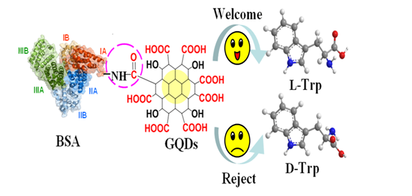 Covalent Functionalization of Bovine Serum Albumin with Graphene Quantum Dots for Stereospecific Molecular RecognitionQiumin Ye, Lili Guo, Datong Wu, Baozhu Yang, Yongxin Tao, Linhong Deng, Yong Kong* 原文鏈接:https://pubs.acs.org/doi/10.1021/acs.analchem.9b02605 牛血清白蛋白(BSA)是一種研究廣泛的血清蛋白,因其具有易溶、成本低、生物相容性高等優(yōu)點已引起研究者的廣泛關(guān)注。近日,課題組制備了BSA 與石墨烯量子點(GQDs)的復合材料,并將其成功應用于色氨酸(Trp)對映體的電化學識別。GQDs與BSA之間的酰胺化反應形成的酰胺鍵破壞了BSA原有的規(guī)整形貌,改變了BSA整體肽鏈的空間構(gòu)型,使BSA分子原本的三維心形結(jié)構(gòu)得以擴展,從而使肽鏈上的手性中心更易于暴露,提高了BSA-GQDs復合物的識別效率。